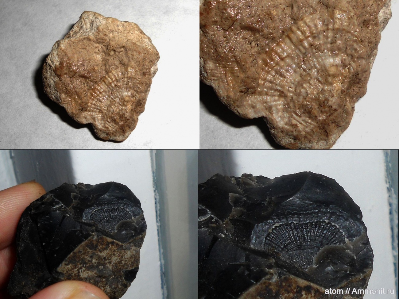 Та, что на карбонатной породе - сохранилась сама створка с раковинным веществом, только она сильно сдавленна и деформированна.