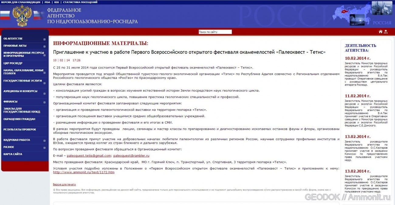 Это приглашение к участию в работе Первого Всероссийского открытого фестиваля окаменелостей «Палеоквест – Тетис», размещено на официальном сайте Федерального агенства по недропользованию.