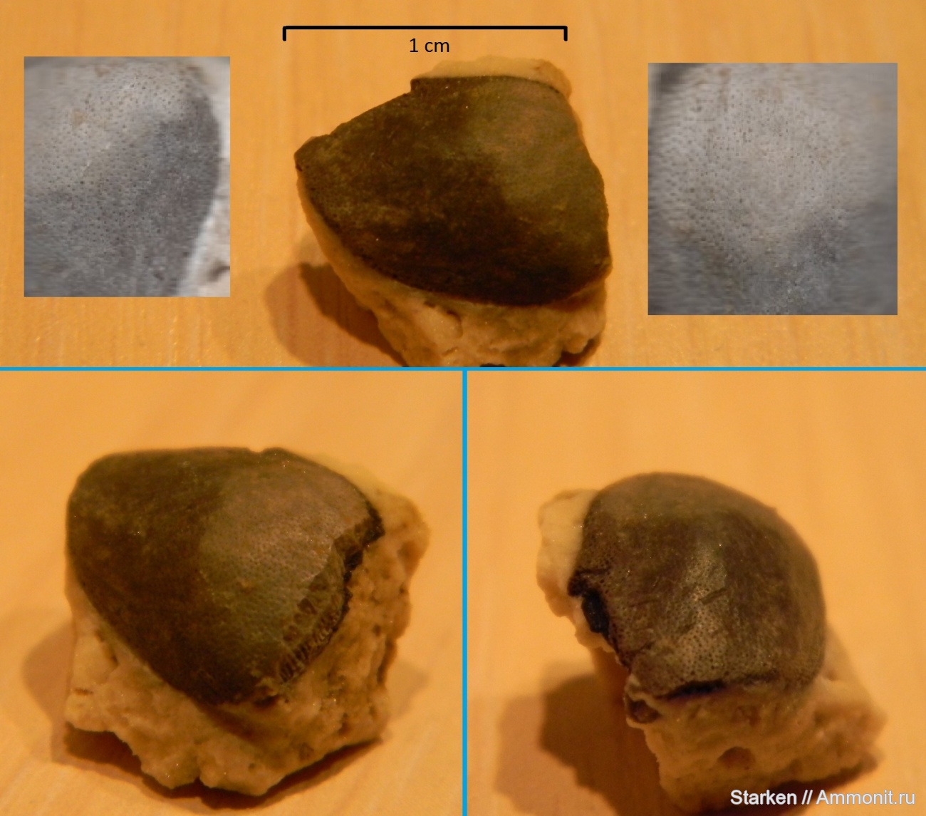 Помимо прочей стандартной и, как мне показалось, немногочисленной среднекарбоновой живности (членики морских лилий, брахиоподы, иглы морских ежей) попался любопытный, хоть и не очень хорошей сохранности, фрагмент зуба. По моему, Sandalodus.