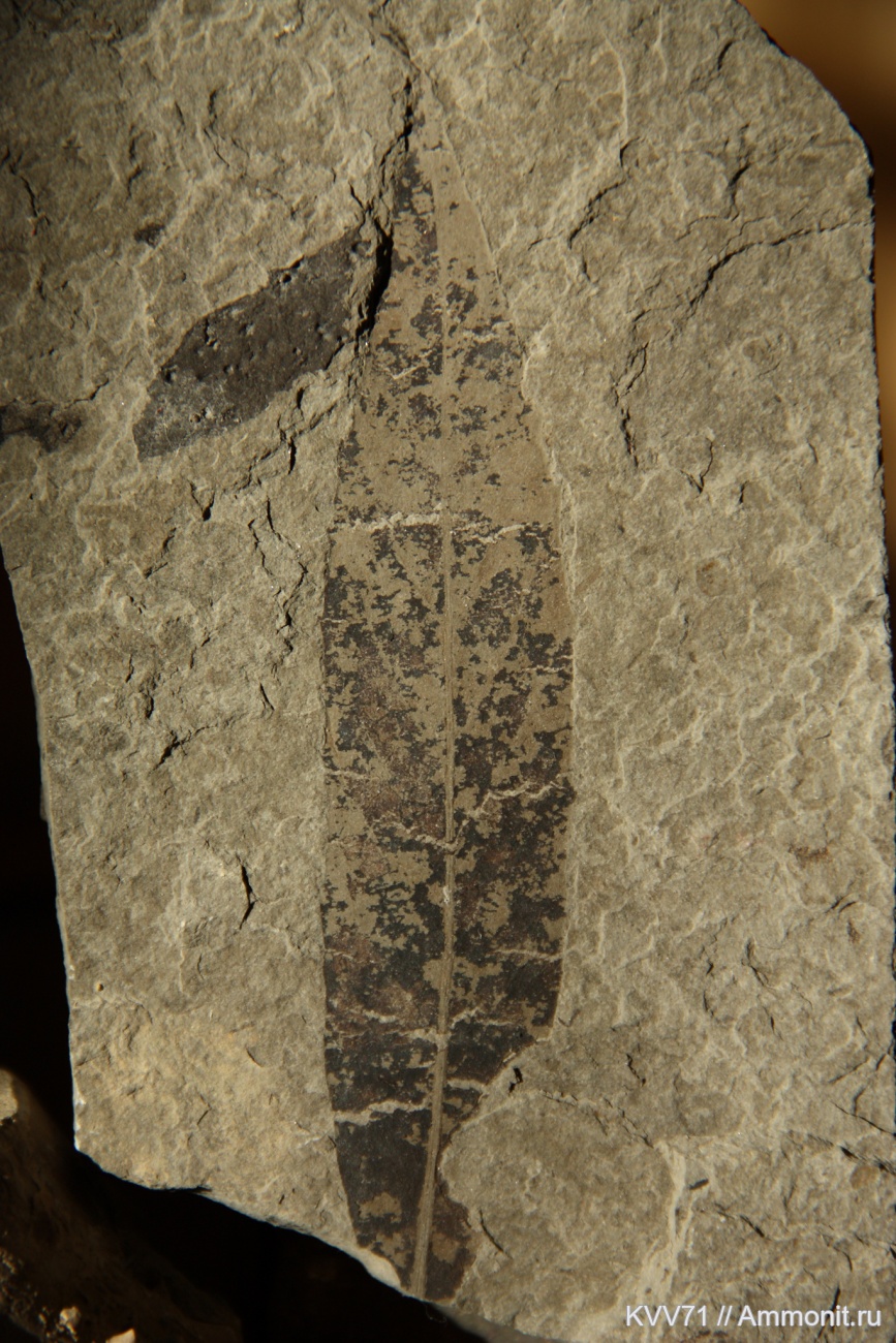Размер листа 11 см. Найден в слоях с рыбами, водорослями и насекомыми.