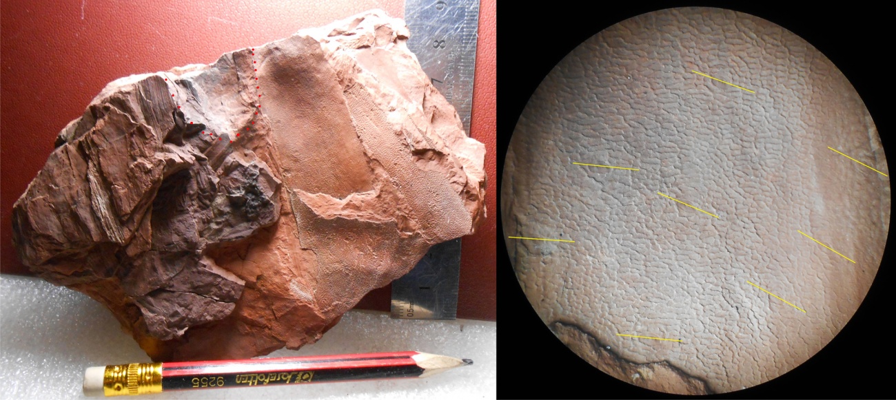 Обратите внимание на поворот горизонтальной оси листового рубца. Листовые рубцы огибают веточный рубец (обозначен слева пунктиром).