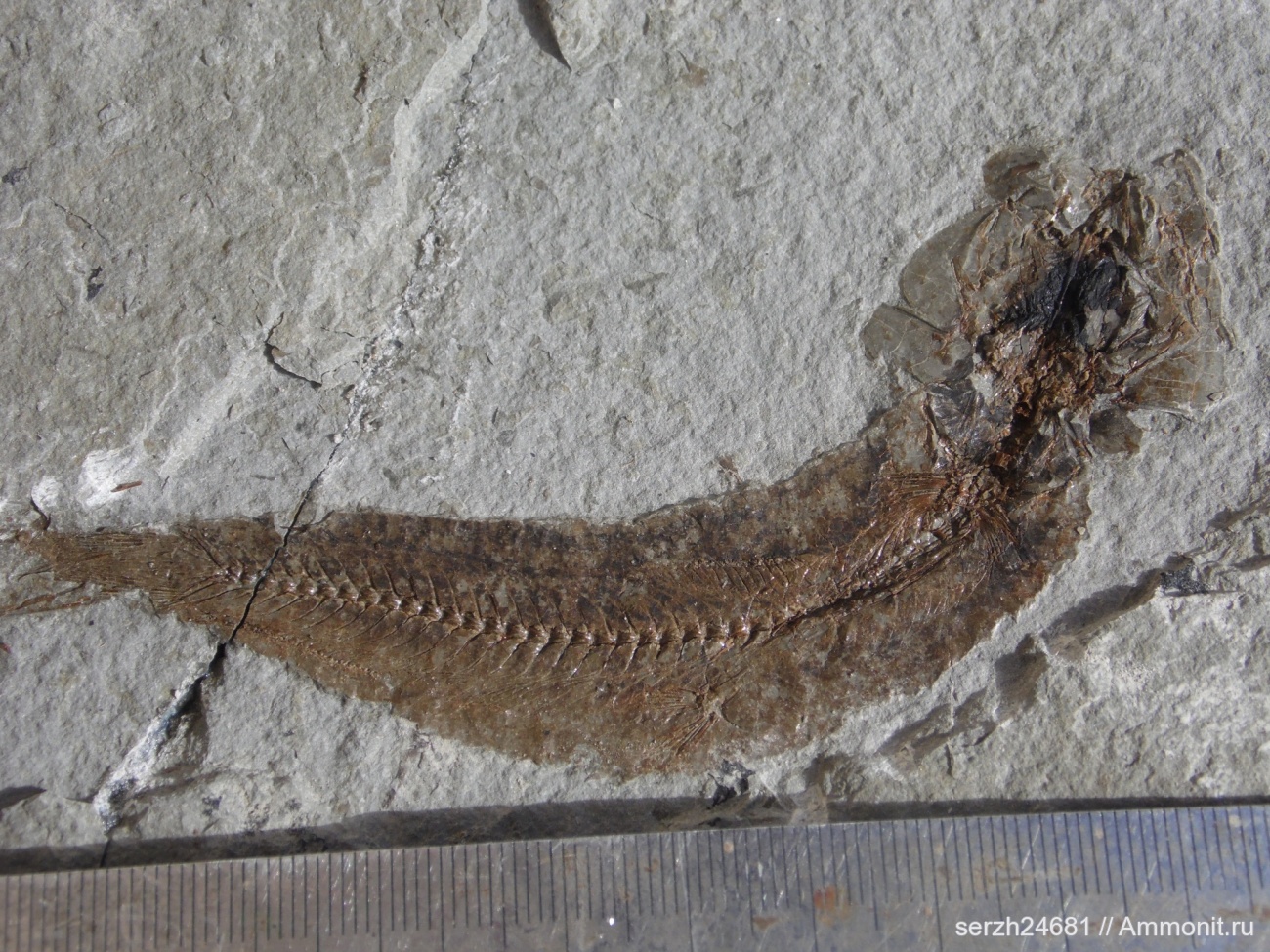 Образец найден на р. Пшеха при расколе мергелевой плиты.Рыба получается с перекрученным позвоночником, головная часть раздавлена сверху, хвостовая сбоку.