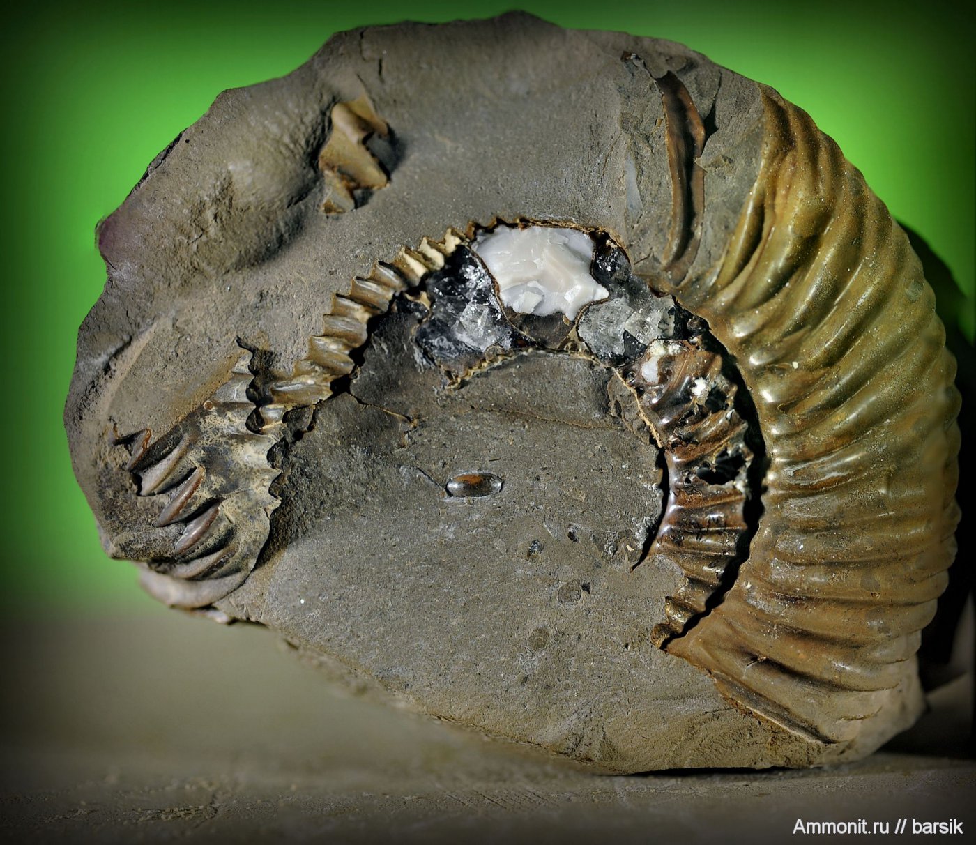 Одна камера аммонита заполнена светлым минералом, а две по краям - темным.