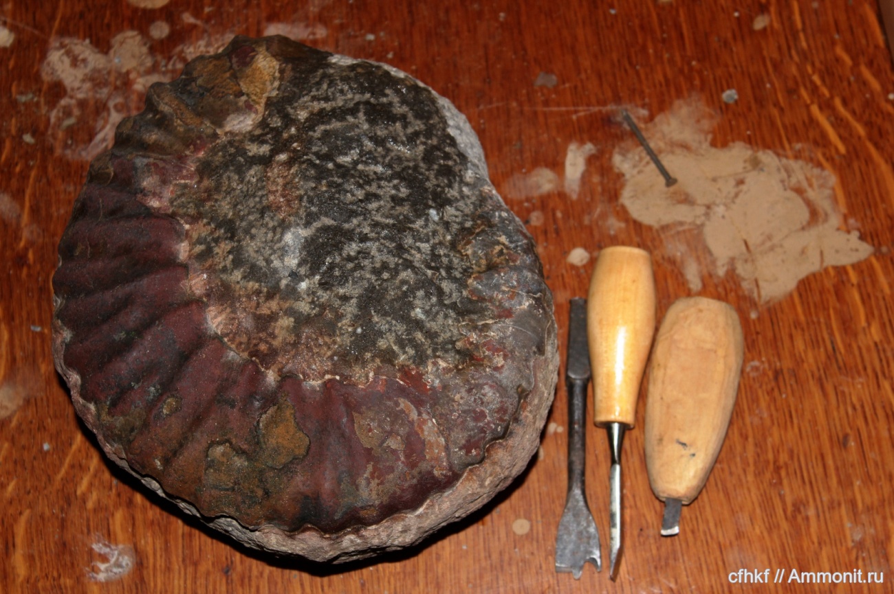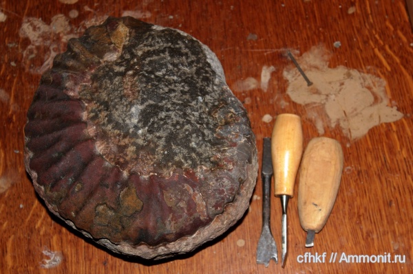 Чтобы легче долбилось можно сделать болгаркой по породе небольшие параллельные насечки, только смотрите, чтоб до аммонита не достали. Потом породу вынимать между насечками зубилом. | ||||||
