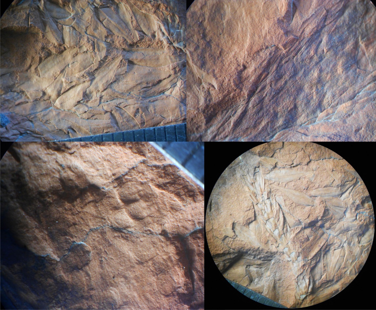 Вверху слева и справа внизу видны спорофиллы шишки, вверху справа - уцелевший фрагмент шишки, слева внизу - выпавшие из шишки спорангии.