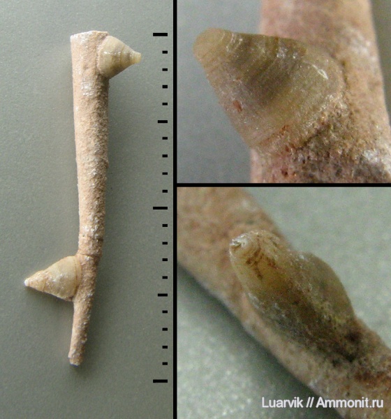 Так как этот образец не единичный, и даже здесь две раковины на разных частях, то второй вариант отпадает. Они явно поселились на части сифона, использую его как "твердый грунт". Для данных слоев это нормально.