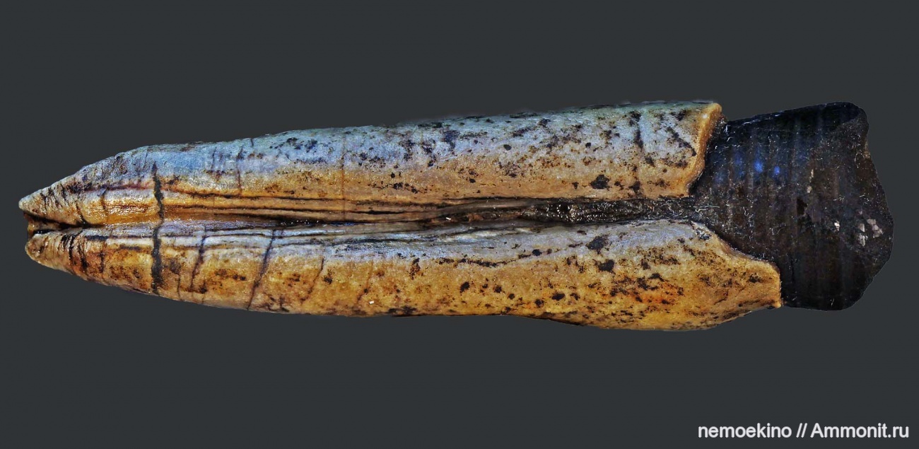 Ростр белемнита с фрагмоконом. Немного помятый. Не привычное замещение и цвет. 88мм.