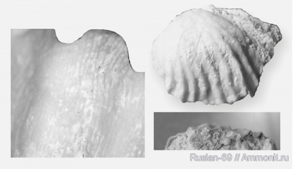 Створка имеет в передней части резкие искривленные радиальные складки.