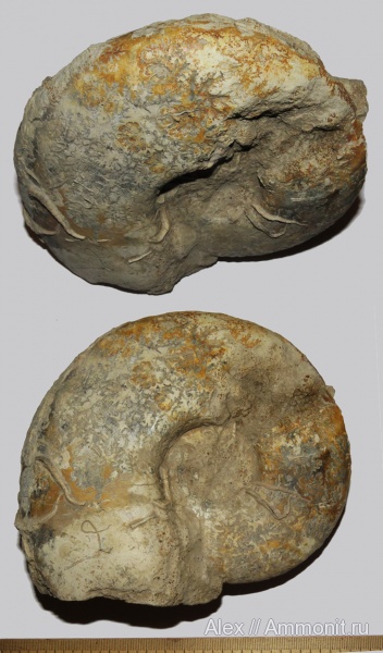 Этот макроконх Quenstedtoceras был найден еще в 2012 году и сфотографирован на месте находки (фото Добыча). Хорошо видно, что аммонит еще в юрском периоде подвергался переотложению - домики серпул прикреплены не к раковине, а непосредственно к окаменевшему ядру.