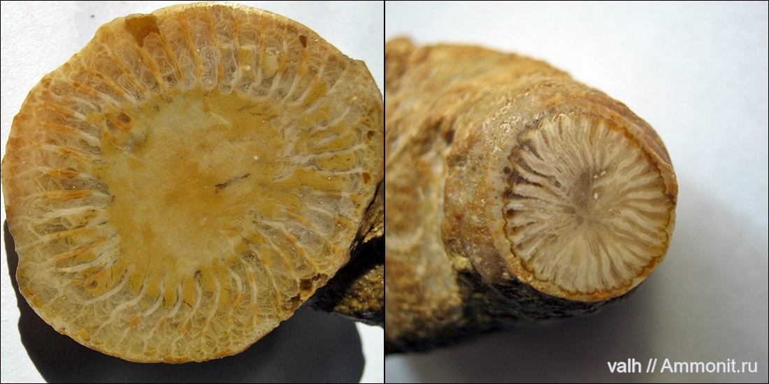 На фото две стадии развития коралла.Справа-средненеаническая,где коралл уже приобрёл черты строения взрослого организма(диаметр среза 12 мм).Слева-взрослая стадия(диаметр среза 37 мм) в развитии коралла(эфебическая).