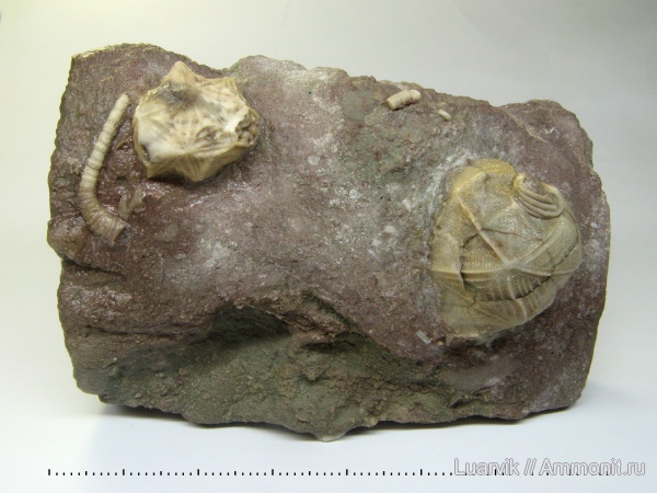 Homocystites insignis, рядом три членика дистальной части его стебля. Базальные ромбопоры в самой середине перекрыты (disjunct pectinirhombs). Чашечка уходит в породу, но, к сожалению, полностью открыть ее не удается - слишком плотная закальциченная порода.