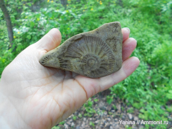В центре отпечаток Proplanulites ex gr. koenigi (Sow.), слева - Kepplerites (Gowericeras) ex gr. gowerianus (Sow.) [нижний келловей, зона Koenigi (нижняя часть)] | ||||||