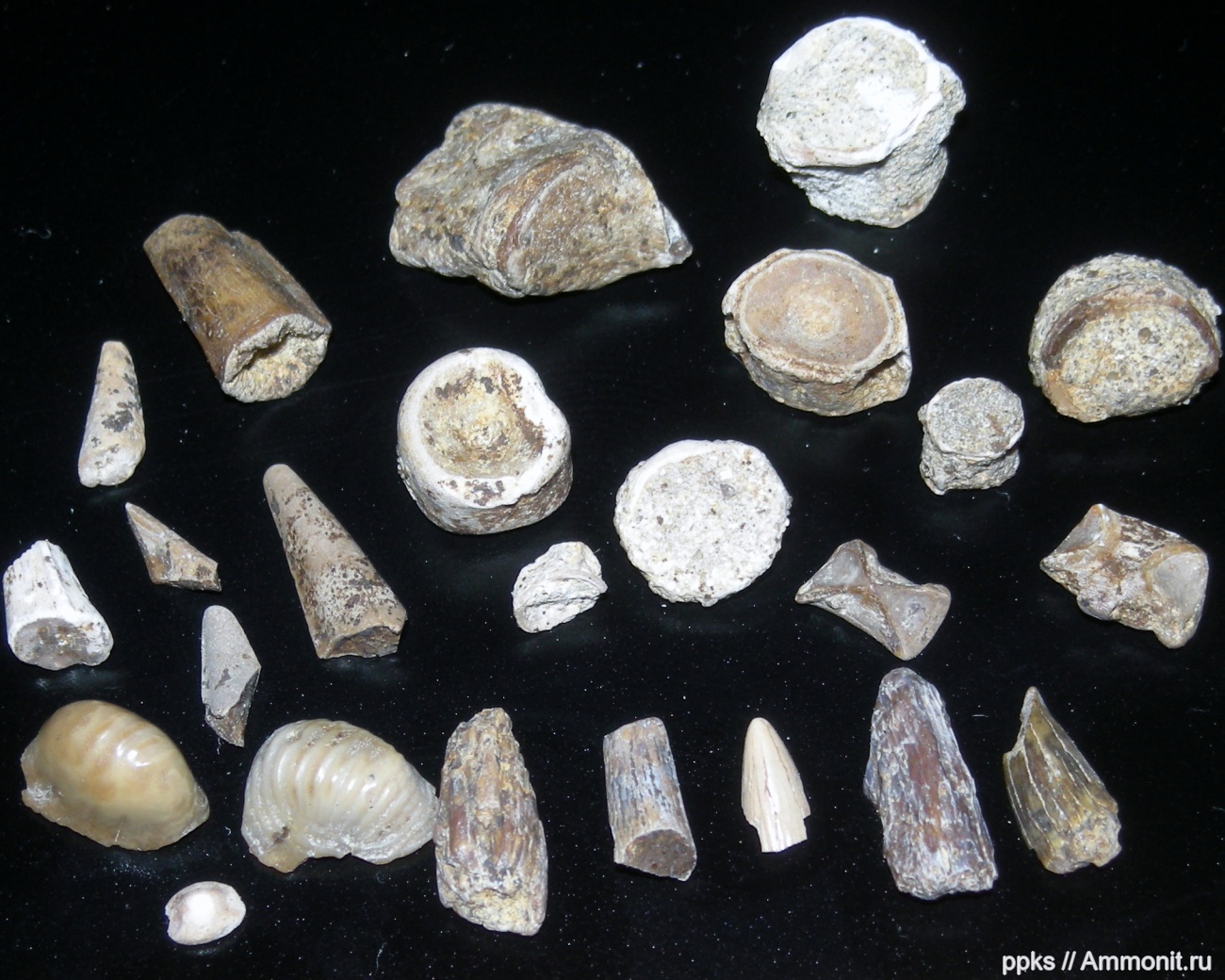 Кроме зубов акул (в том же слое породы) найдены окаменелости явно другого типа. Позвонки рыб диаметром от 4 до 8 мм, слева на фото обломки зубов рыб, слева внизу два зуба похожих на зубы хрящевой рыбы, по поводу фрагментов зубов в нижнем ряду сомнения - они другие по структуре, в сечении круглые.