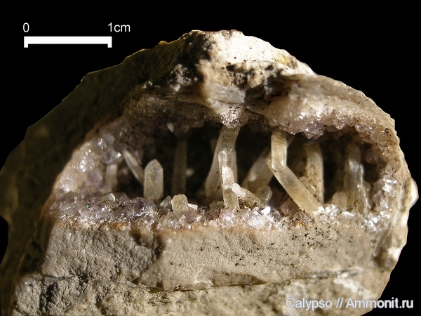 Естественный поперечный скол неопределимой продуктиды, заключенной в кремнистый известняк. Висцеральная полость оказалась не заполненной осадком. Её внутренние стенки инкрустированны слабеньким ненасыщенным аметистом, местами переходящим в прозрачный кварц. На кристаллики кварца позднее наросли длинные "карандашики" кальцита. Всё это связано, очевидно, с первичным проникновением и циркуляцией вод, насыщенных кремнезёмом внутри висцеральной полости раковины, с постепенным образованием кристаллов кварца. Позднее нарастание кристаллов кальцита на кварц, можно объяснить сменой химического состава окружающей среды с преобладанием карбонатов.