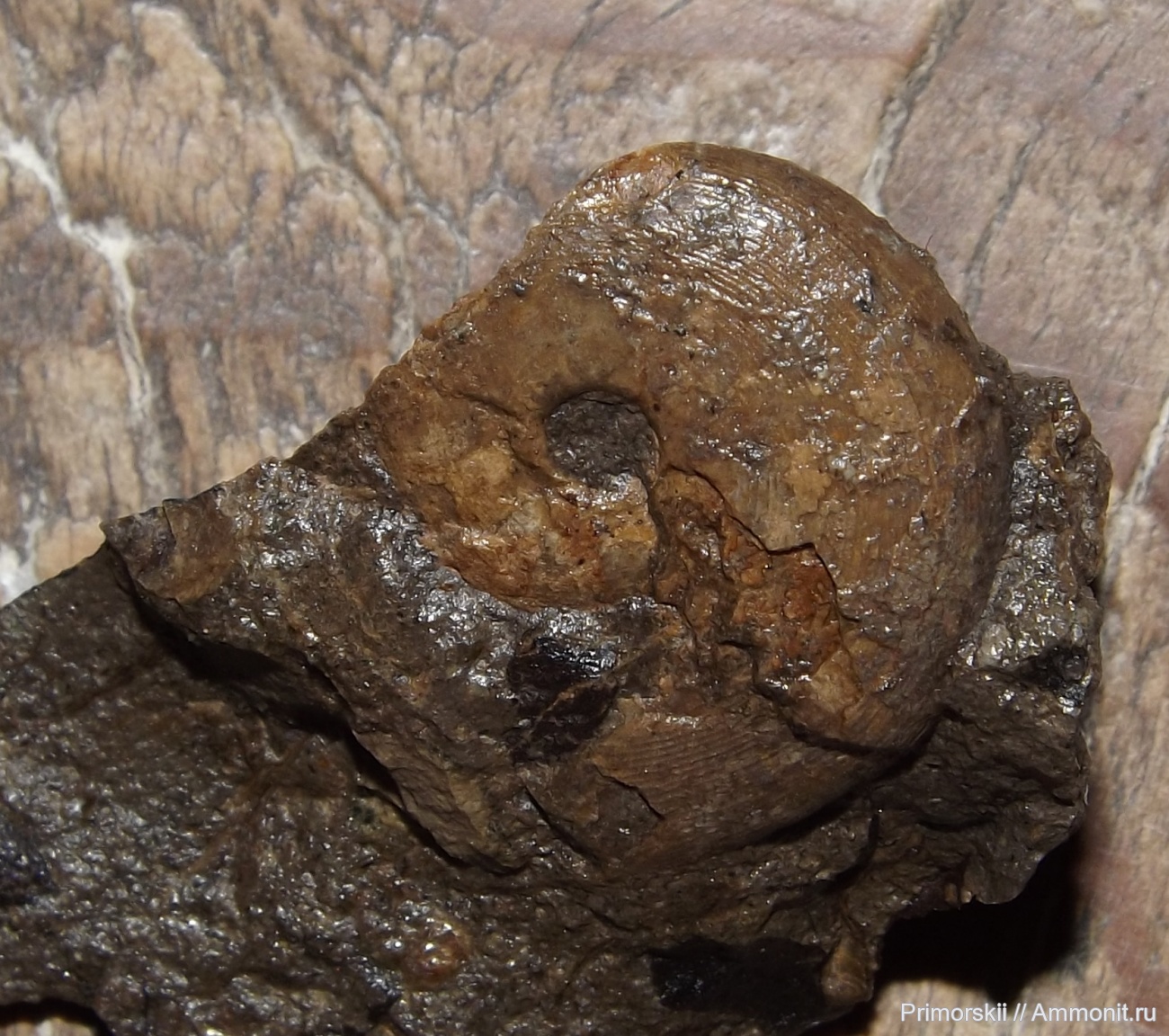 Фрагмокон c уцелевшей частью жилой камеры; Южное Приморье, о. Русский, водораздел бух. Парис-Уссурийский зал.; средний триас, анизийской ярус, зона Acrochordiceras kiparisovae.