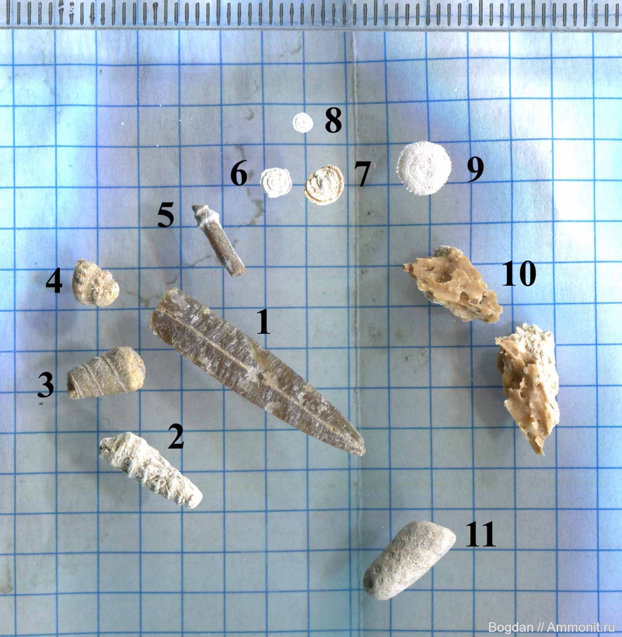 1 белемнит, 2-4 гастропода, 5 игла морского ежа, 6-9 нумулиты, 10 ?, 11 коралл. | ||||||
