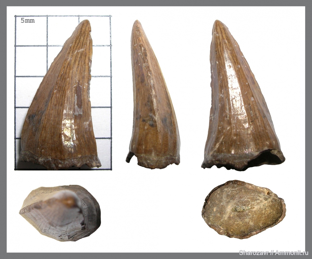 У plioplatecarpus зубы колющего типа, имеют более круглое сечение в середине коронки и отстутствут грани. Здесь же присутствуют ярко выраженные грани. Если принять во внимание, что статистически 80 % находок на разрезе это plioplatecarpus sp и mosasaurus sp., то вывод напрашивается сам. Кстати, А.А. Ярков часто обозначает до вида hoffmanni. Других видов не слышал. Моё мнение, это mosasaurus hoffmanni. | ||||||