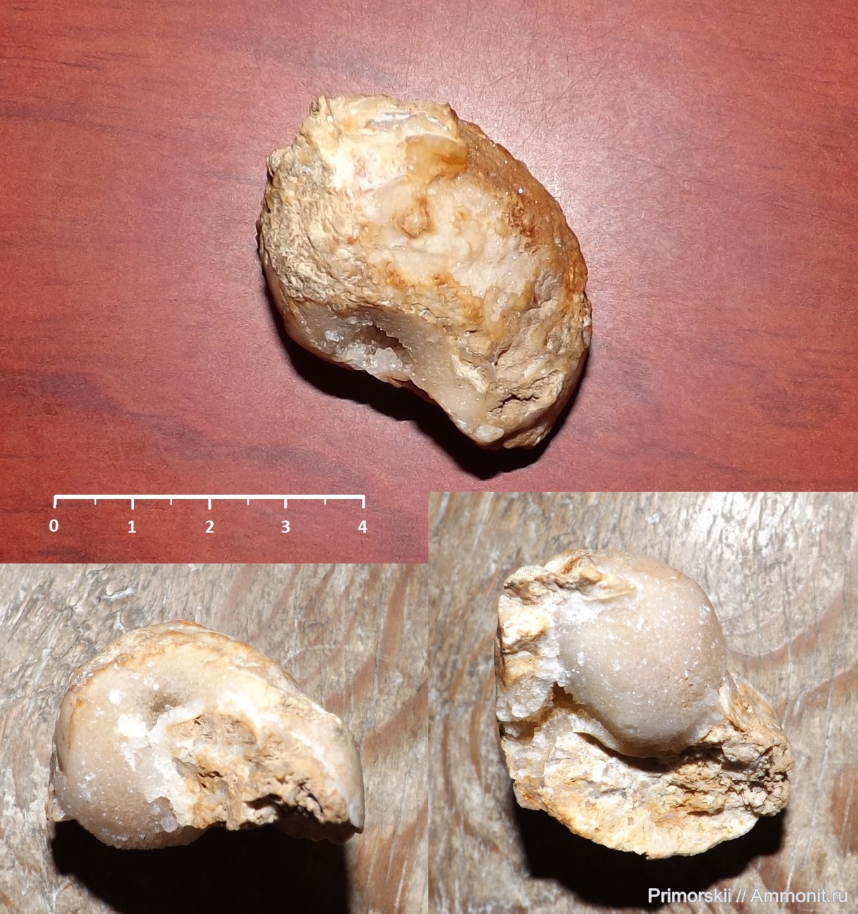 Замещёние ядра (внутреннее) кремнезёмом, наружнее - раскристаллизация кварцем(размер зёрен до 2мм фото).
