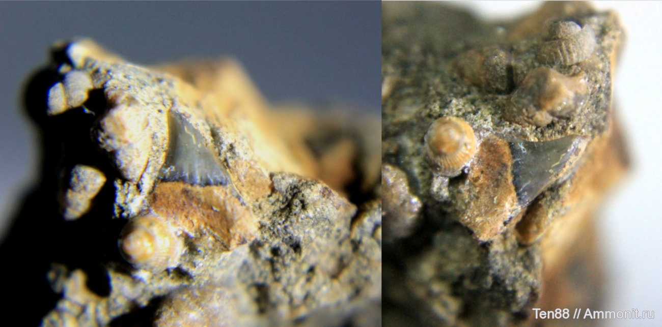 Хм, порода. Смесь мелких, как бы зацементированных, гастропод. И проблема еще в том, что он располагается буквально в 0,6 см. от конца конкреции ( ну, теперь это ее фрагментик), а слой примерно в 1,5 см. до этой внешней стороны просто железобетонный. Химическим? А чем? А это не растворит сам зуб? | ||||||