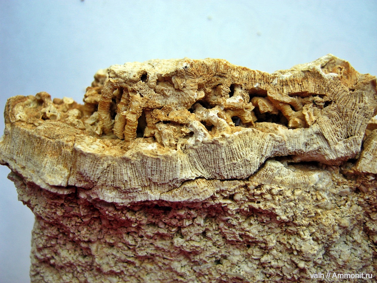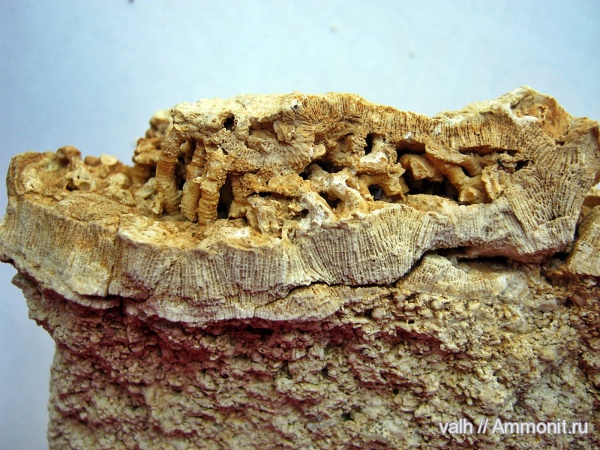 На фото фрагмент обрастания коралла Syringopora губкой Chaetetes.