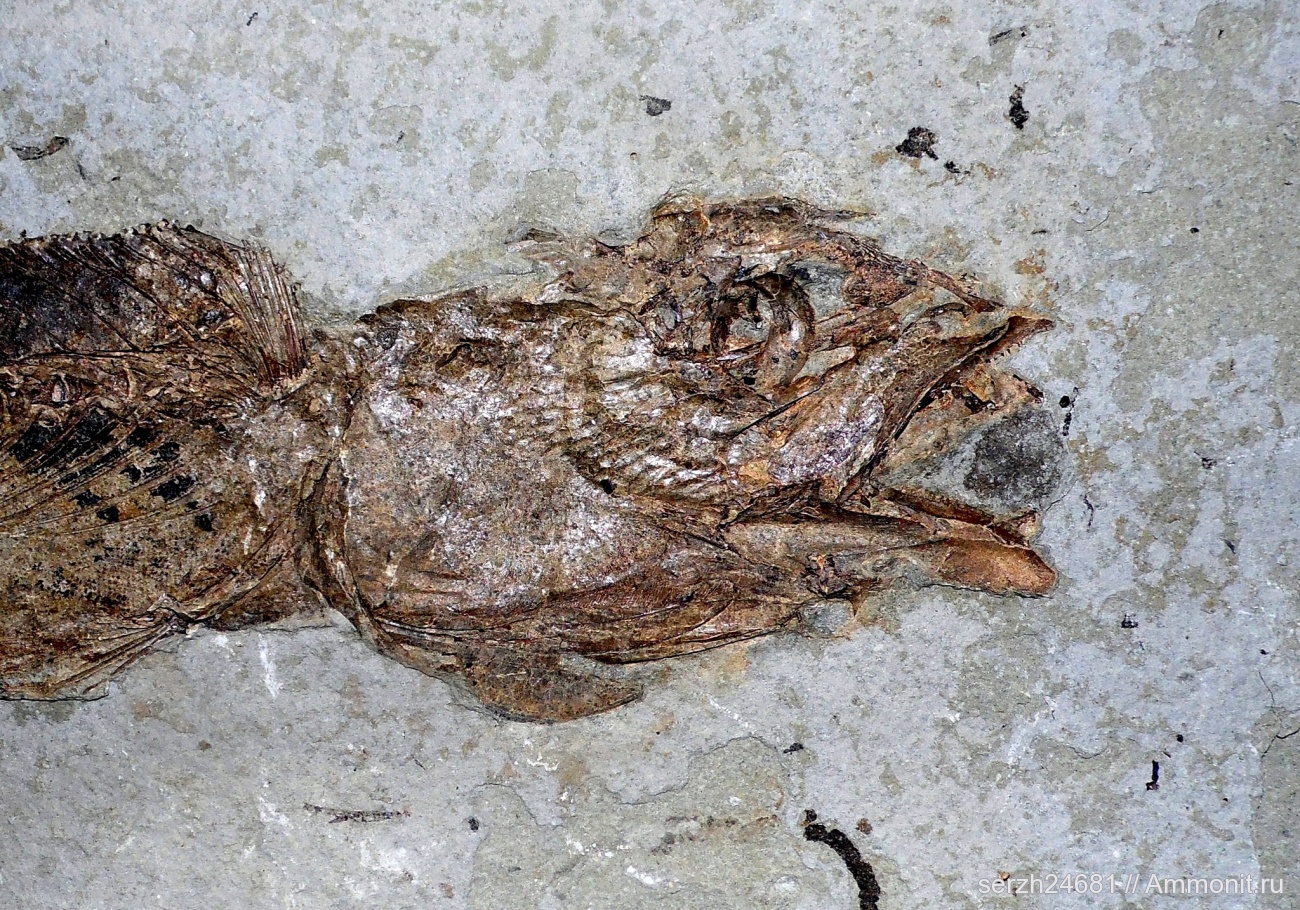 Образец найден на р. Пшеха при расколе мергелевой плиты.Длинна головы по окончание жабер 13см.