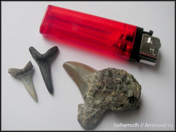 Зуб отодуса с куском породы (глауконитовый песчаник), зажигалкой для масштаба и зубами, вероятно, carcharias sp, найденными примерно в том же ярусе.