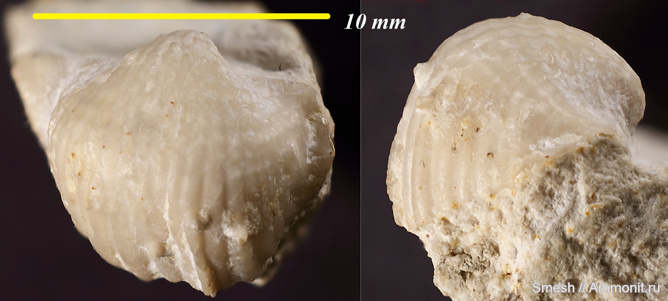 Ещё одна малышка, на этот раз из отряда Productida оказалась обделена вниманием палеонтологов-любителей - Marginifera timanica Tschernyschew, Руководящая форма в С2pd Московской синеклизы. На сайте есть всего две Маргиниферы ( Marginifera, семейство Productidae и целая брахиопода Marginifera ) без видового определения. Сверившись с Определителем Сарычевой и Сокольской ( Резко коленчатая раковина, вытянутая в ширину, размером 10—15 мм. Макушка широкая, плоская, синус отсутствует. Ушки среднего размера, заостренные, хорошо обособленные. Ребристость на всей раковине отчетливая, ребра правильные, относительно грубые, расширяющиеся к лобному краю, где на 10 мм 10—14 ребер. Концентрические морщины образуют на макушке отчетливый сетчатый орнамент. Иглы, кроме главных 6 симметрично расположенных игл, редки.) определяю нашу брахиоподу как молодую особь M. timanica.