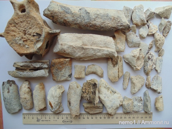 Позвонок хвостового отдела,да,неплохой сохранности,фаланга,несколько фрагментов челюсти и ребер.