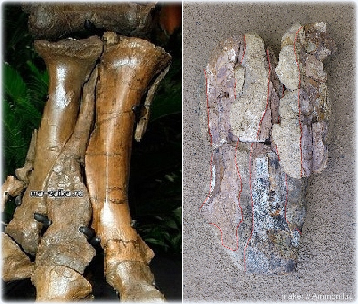 Вот собрал ещё верхнюю часть стопы и отметил границы костей и породы красным. Мда... Наглядность материала мягко говоря... В общем - теропод. Верхняя часть стопы состоит из трех костей. В поперечнеке где-то 25-30 см. Здоровая была зверюга... Центральная и левая кость по стоению очень напоминает тираннозавровую (слева) или его предка. Если бы не берриас, можно бы было подумать, что это она.