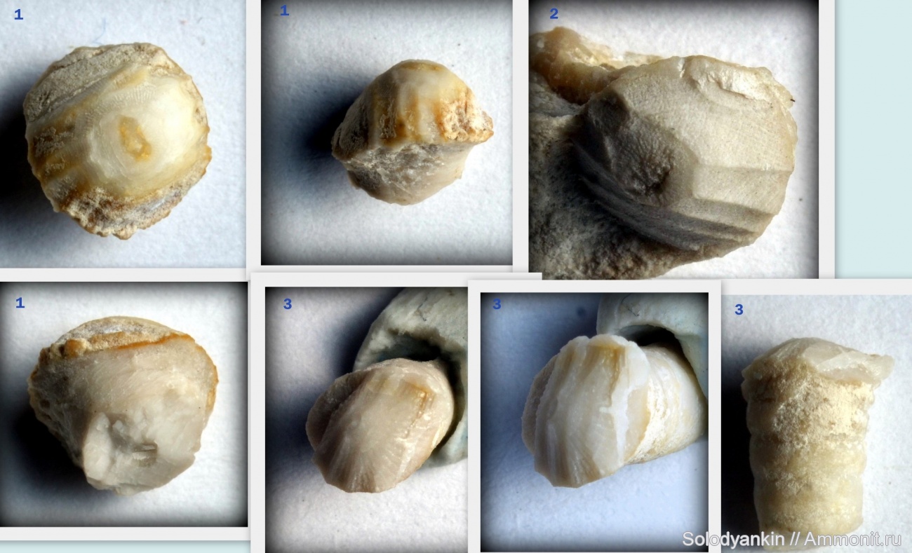 Среди немногочисленных находок, попалось 4 фрагмента стеблей морских лилий. Необычными показались выпуклые окончания стеблей с небольшими плоскими площадками в центре, с параллельными ребрами и едва заметной радиальной струйчатостью (надеюсь видно на фото).