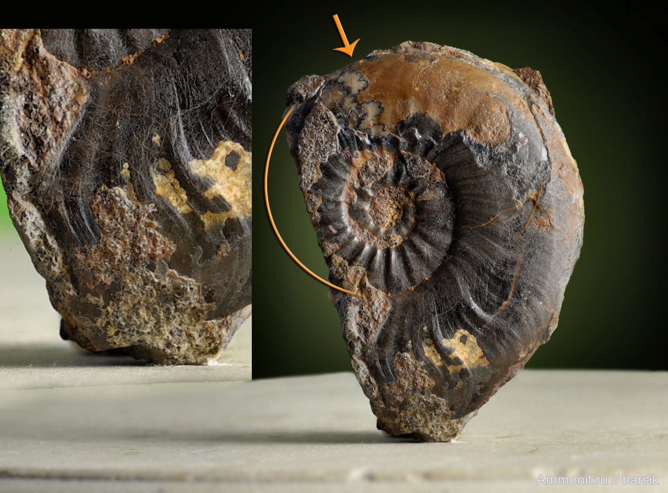 Фрагмент слепка с остатками раковины, диаметром 52мм. На ядре по стрелке хорошо видно начало жилой камеры и возможно этот аммонит с устьем. Хорошо видно достаточно четкую границу в верхней части устья и выгибание струйчатых ребер при начале формирования ушек по центру бокового края. Нижняя часть устья в твердой породе, но судя по характеру изгиба ребер, в нижней части находился тонкий острый ростр.