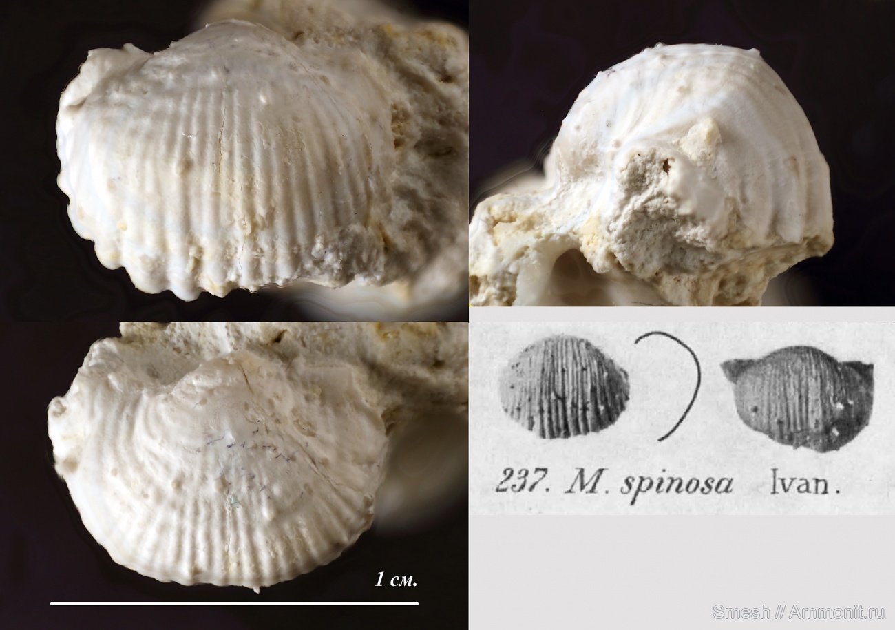 Попасть в песковский карьер очень сложно, поэтому каждая интересная находка оттуда ценна вдвойне. Таких брахиопод мне до сих пор не попадалось, и неудивительно, ведь у Сарычевой и Сокольской ("Определитель...") отмечено, что эта брахиопода "довольно редко" встречается у нас. Описание моего образца хорошо соответствует приведённому в определителе: "Брюшная створка средневыпуклая, коленчатая. Синус очень слабый, виден только в средней части или совсем отсутствует. Ушки маленькие, обособленные. Ребристость отчетливая, ребра выпуклые, несколько расширяющиеся к лобному краю, где на 10мм 12- 16 ребер. Концентрические морщины развиты слабо. На лобной половине брюшной створки 15—18 крупных игл, расположенных в шахматном порядке на расстоянии 2—3 мм одна от другой. На смычном крае по 2—3 иглы с каждой стороны." Единственное, что меня смущает - размер. Моя брахиопода имеет ~9 мм, а в Определителе указано 17-19 мм. И, похоже, что моя брахиопода взрослая. Так что не исключено, что это что-то не попавшее в Определитель.