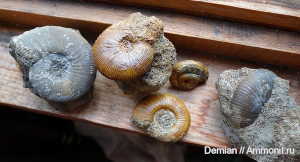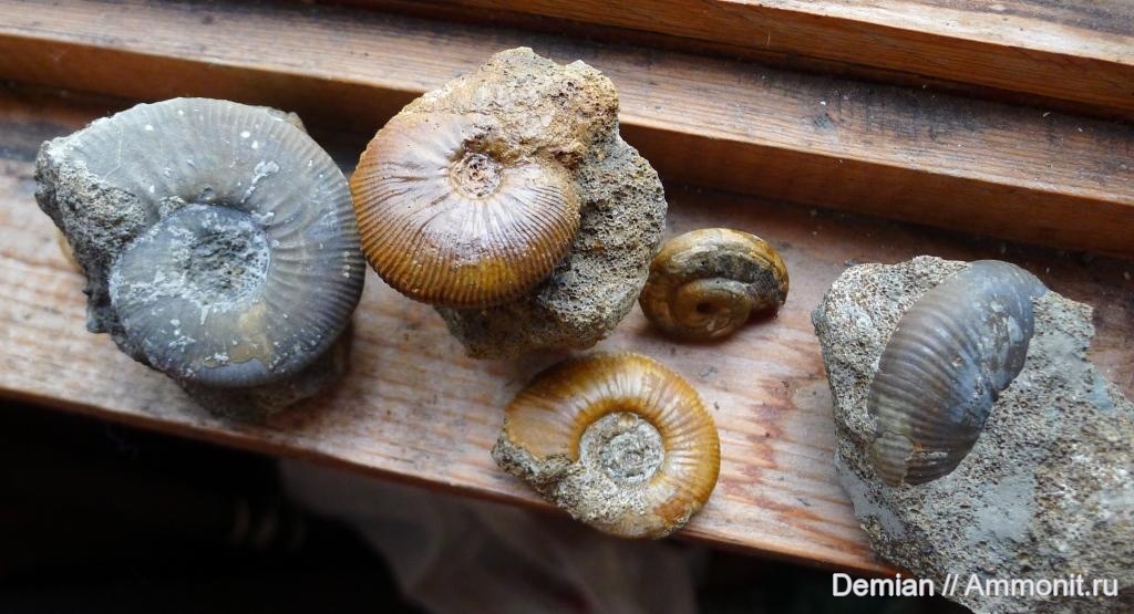 Согласен, но я пока не могу понять кто лежит слева. Справа в породе Rondiceras, внизу рядом с гастроподой мелкий перисфинктид. | ||||||