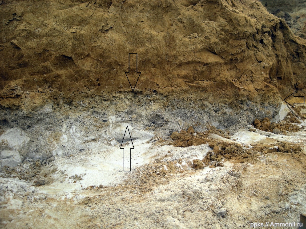 Возможно фотография будет полезна новичкам, решившим посетить это волшебное место. При поиске слоя, содержащего окаменелости, необходимо найти место стыка слоев ярко-рыжего и чисто белого песков, между ними серый слой содержащий все будущие находки. С восточной стороны карьера (там где сделана фотография) слой не сплошной, а лежит отдельными линзами.