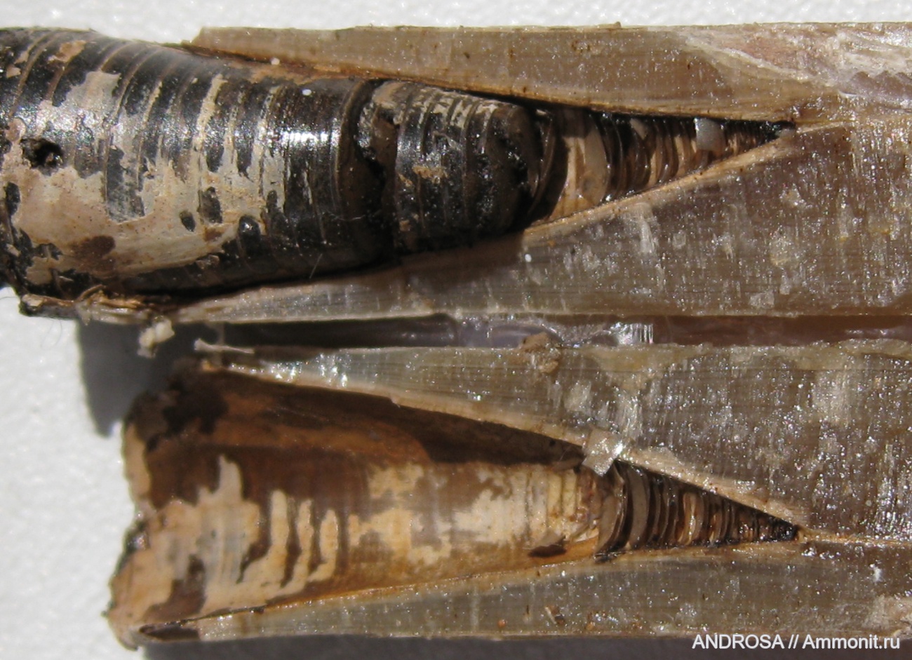 Хороший образец. Видно ассиметричное и подогнутое положение полости в ростре. | ||||||