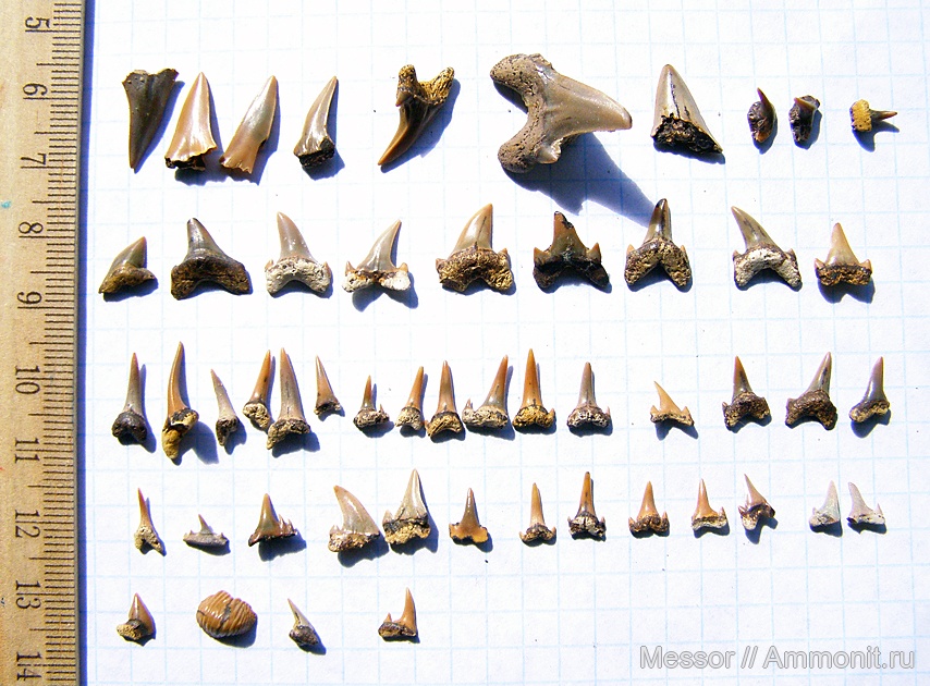 Зубы Cretoxyrhina, Archeolamna, Eostriatolamia, Palaeoanacorax, Ptychodus, Paraortchacodus, Synechodus, Leptostyrax. | ||||||