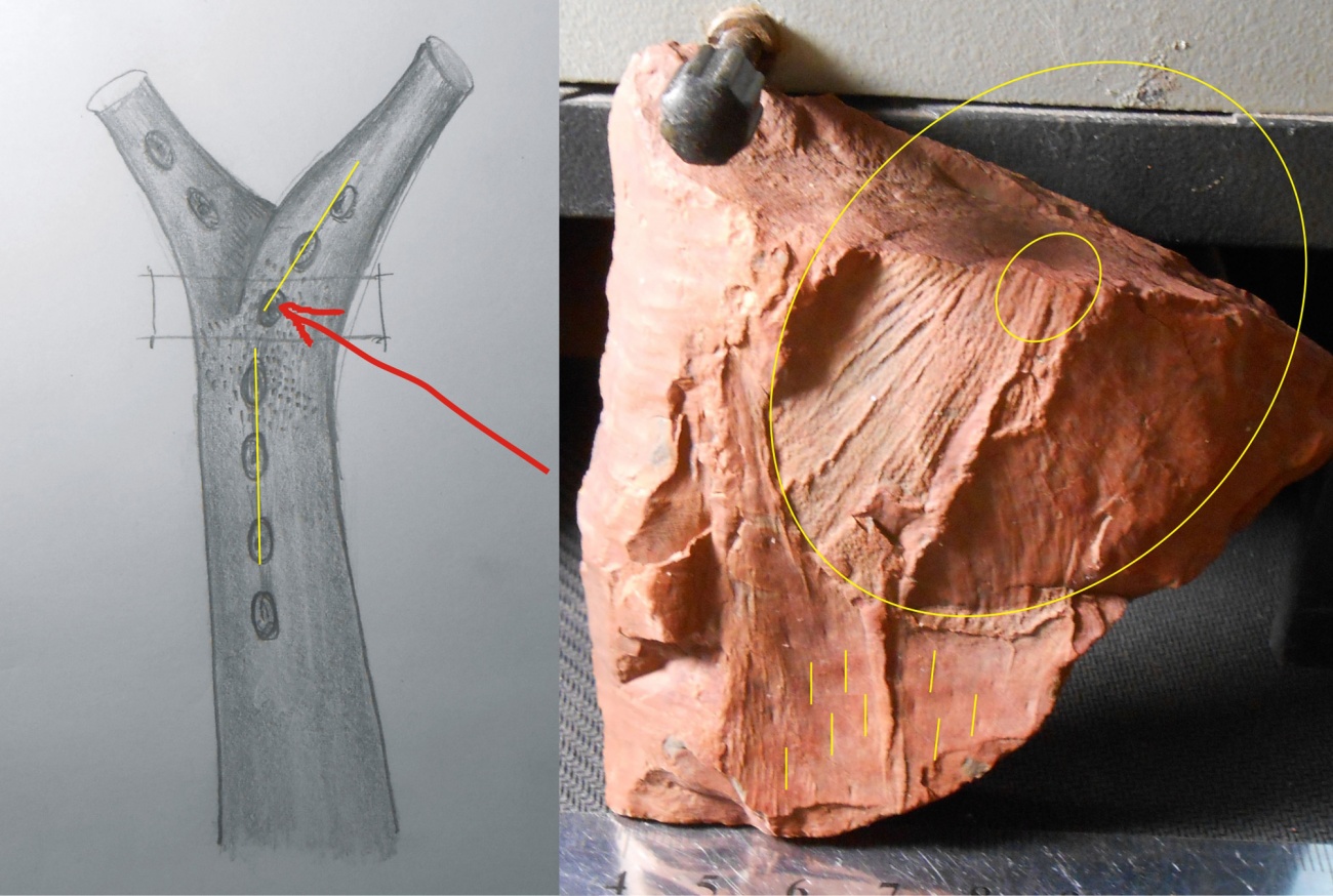 Вчера разместил на форуме свеженайденный фрагмент веточного рубца ботродендрона. Необычность образца в том, что оси ствола и веточного рубца расположены под углом, хотя должны совпадать. Предполагаю, что найденный рубец располагался в зоне главной дихотомии ствола (там, где он впервые разделяется на две ветви). Подробности можно увидеть на рисунке.