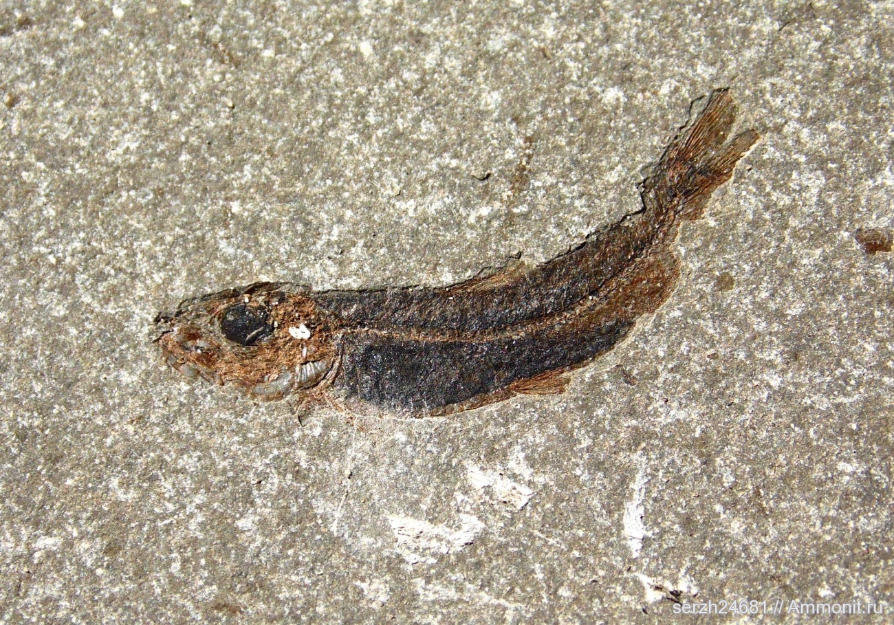 Образец был найден на р.Туха при расколе мергелевой плиты.Длинна рыбки 2.5см.