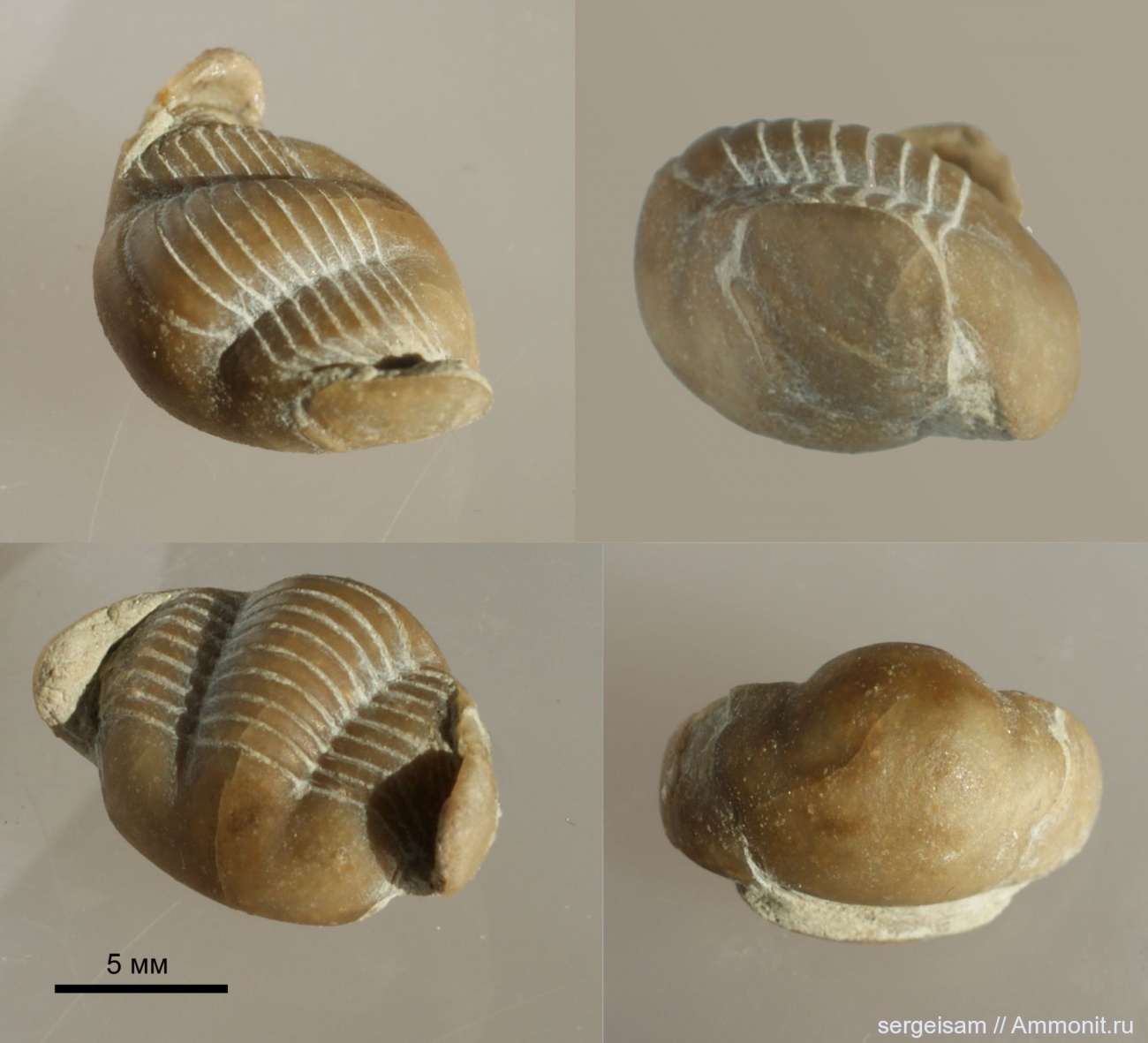 Этот маленький трилобит был найден в Волхове около ГЭС в прошлом году. Первоначально я его принял за брахиоподу, но дома при расчистке оказался вполне целенький трилобит. Буду признателен за определение его видовой принадлежности