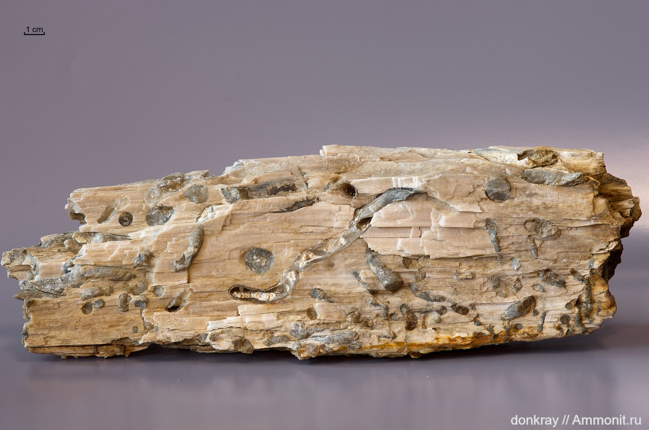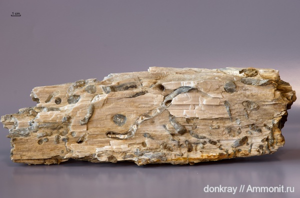 Это кусочек(~30см) большого ствола дерева(предположительно кипариса) с ходами молюсков древоточцев, найденный в Ростовской обл., Тарасовский р-он(возле р.Калитва). Древесина замещена белым опалом, а ходы халцедоном.