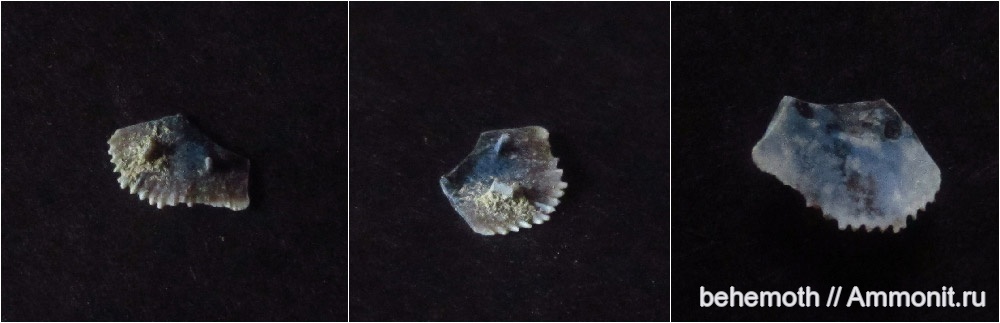 Почему-то кажется что это часть конечности какого-нить ракообразного морского. Но может быть и часть моллюска, например прикрывающей устье крышечки, или пилильного аппарата. В общем, я не имею понятия пока. Особенно удивляют выросты на одной из сторон, словно остатки рукоятки щита. Может к ним крепились сухожилия, но вряд ли - эта сторона как раз имеет рельеф у пилки, так что скорее она внешняя.
