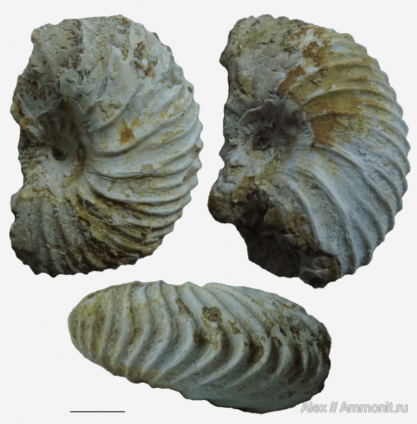 Это фрагмокон и в слое у этого аммонита были видны остатки широкой жилой камеры с высокой пупковой стенкой, но к сожалению ее не удалось сохранить. Вероятно, это был некрупный макроконх. Длина масштабного отрезка 1 см.