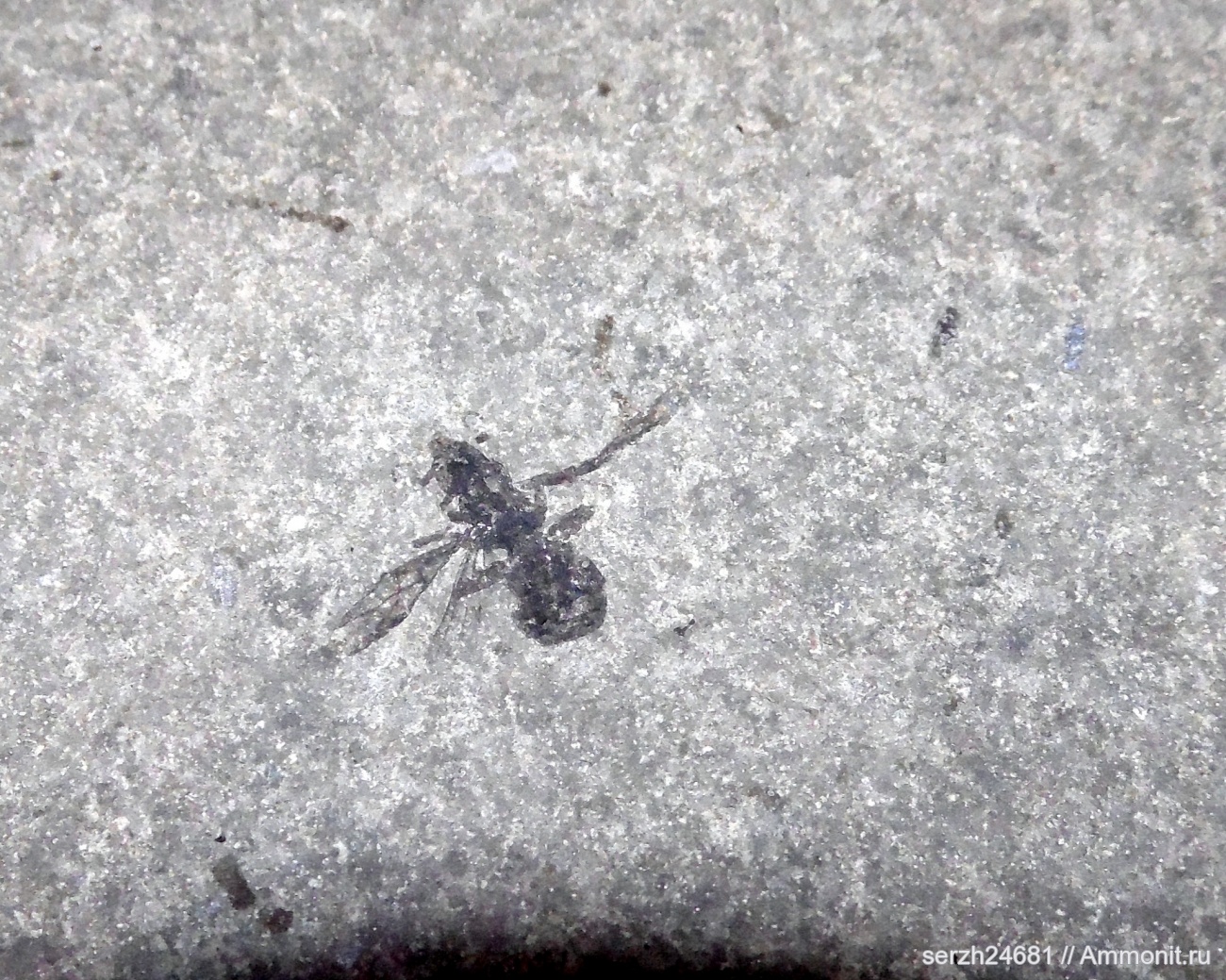 Образец был найден на р.Туха при расколе мергелевой плиты.Длинна тельца 1.2см. Предположительно относится к перепончатокрылым насекомым.Контротпечатокфото