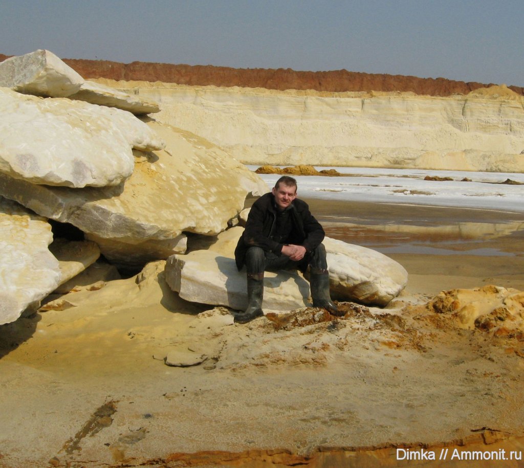 к сожалению аммониты вообще в этом карьере встречаются нечасто, но с виргатитами мне просто повезло, я приехал весной и наткнулся на фосфориты зоны виргатус ни кем до меня не тронутые и копать вообще не пришлось, просто прошел и собрал торчащие из породы аммониты, всего за одну поездку попалось (я не считаю обломки, их довольно много) 4 V. virgatus и один V. pallasianus, но при повторном посещении карьера я не нашел ни одного целого виргатита, везде валяются одни обломки, а копать пока там негде, слишком тоненькие виргатитовые отвалы. С зоной subditus дела обстоят лучше, есть где поковыряться, много плотного фосфоритового песчанника, переполненного аммонитовыми перламутровыми обломками, но встречаются и целые, небольшие около 3-5 см. в диаметре двух родов: craspedites и garniericeras. | ||||||