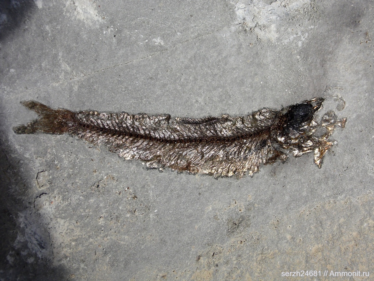Образец был найден на р.Пшеха при расколе мергелевой плиты.Длинна рыбы 13см..Предположительно принадлежит к семейству сельдевые (Clupea sp ).