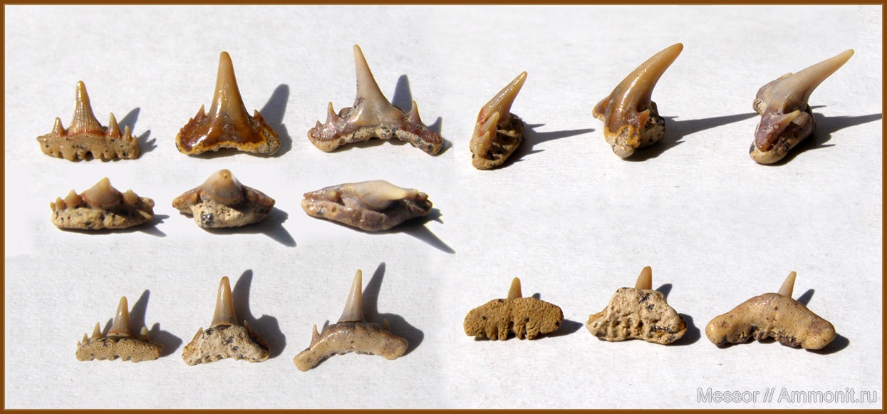 Зубы из северной стенки карьера. Размер наибольшего - 9 мм "в размахе корней".