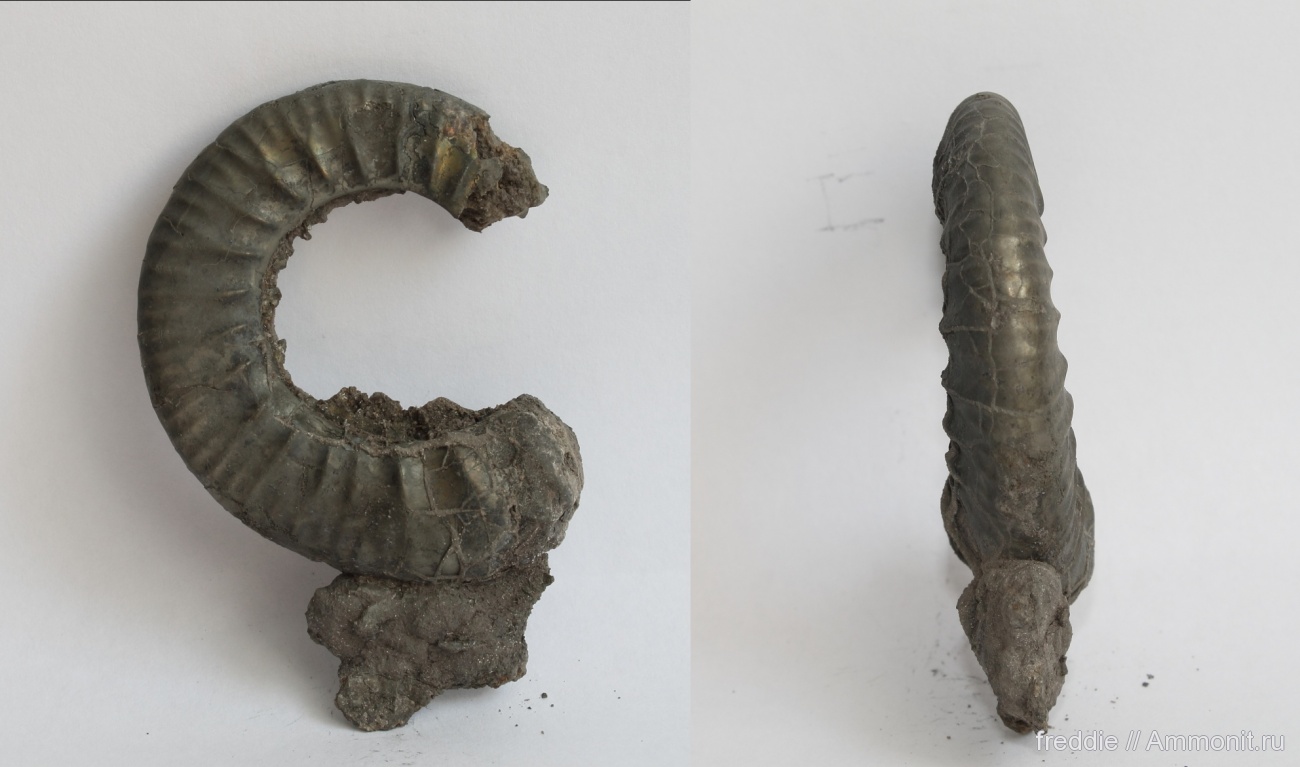 В прошлые выходные обнаружил пиритизированную жилую камеру неизвестного мне аммонита в толще нижнекелловейских глин, ничего подобного ранее я не обнаруживал. Похожая форма встречается в более поздних келловейских отложениях у Proplanulites, но в отличие от него у этого образца более уплощенные и менее высокие обороты.