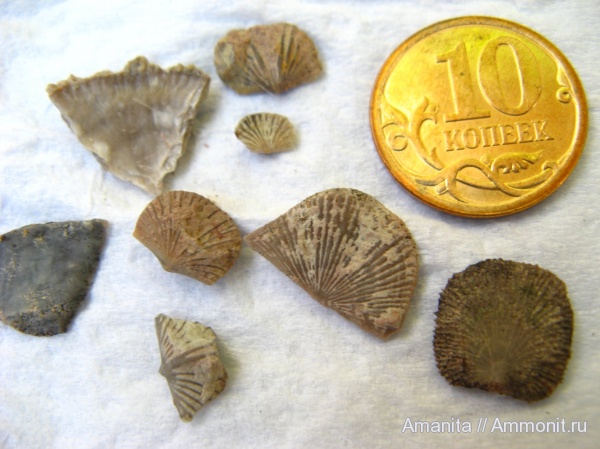 серая створка слева - Bekkerina dorsata dorsata (Bekker), правее неё ближе к центру - Dalmanella? aluverensis Hints, под ней, внизу - Platystrophia kljasinensis Zuykov, ниже 10коп слева - спинная створка Vellamo praeemarginata Opik, справа - Orthisocrania curvicostae (Huene). Platystrophia dentata lata Alihova - сверху по центру