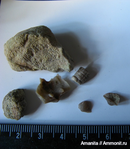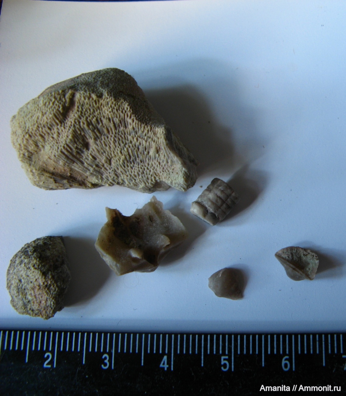 Размер находок - от нескольких миллиметров до нескольких сантиметров. Слева вверху мшанка "в разрезе", раковинки внизу справа опознать не удалось. В середине "клыки" замочного края, они попадались не раз, но целой раковины не нашлось.