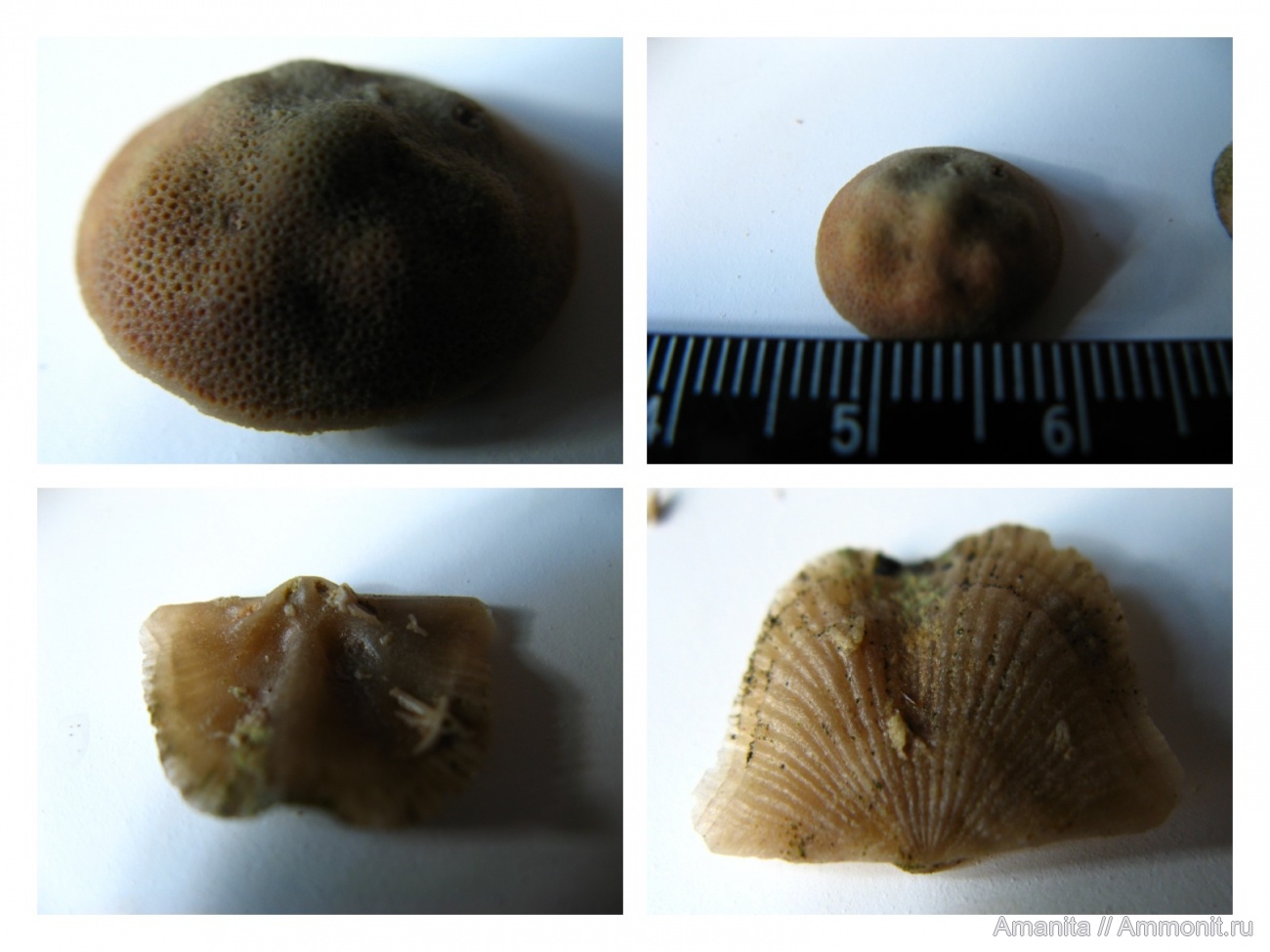мшанка - Mesotrypa bystrovi tuberculata Modzalevskaya, створка - Vellamo sp. Очень интересное прикрепительное образование (холдфаст) морской лилии внутри. | ||||||